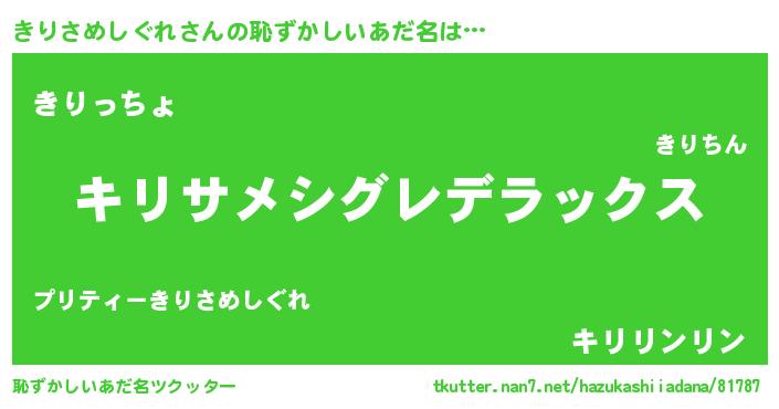 | 男性向けラノベタイトル風あだ名 | 『きりさめしぐれ~年齢イコール彼女いない歴の魔法使い~』 |
