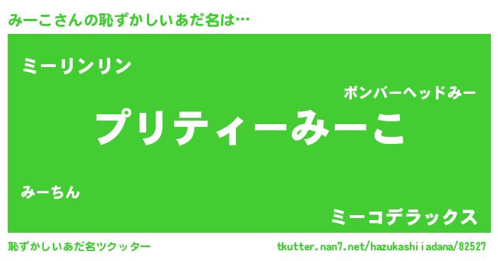 | 男性向けラノベタイトル風あだ名 | 『みーこの憂鬱』『魔弾の王とみーこ』 |