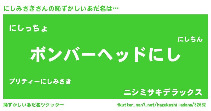 | 男性向けラノベタイトル風あだ名 | 『おまえをオタクにしてやるから、俺をにしみさきにしてくれ! 』 |