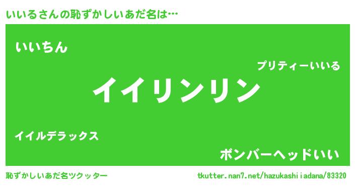 いいるさんの恥ずかしいあだ名は… 『イイリンリン』『いいちん』『ボンバーヘッドいい』 ツクッター #恥ずかしいあだ名ツクッター http://tkutter.nan7.net/hazukashiiadana/83320/