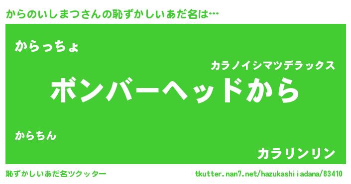 | 男性向けラノベタイトル風あだ名 | 『ノーゲーム・ノーカラノイシマツ』 |