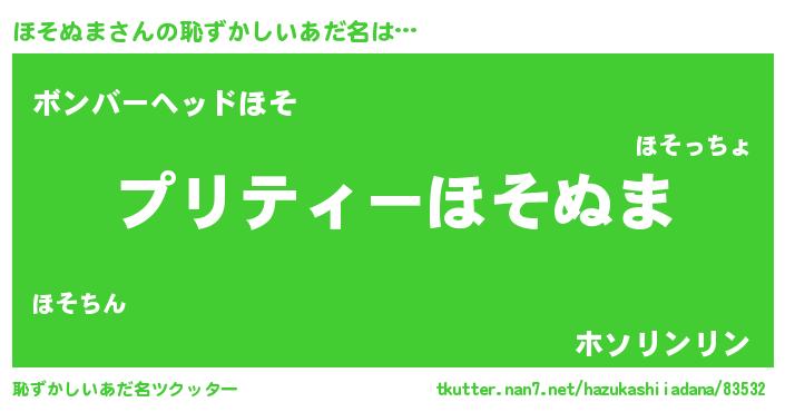 | 男性向けラノベタイトル風あだ名 | 『ほそぬまに滅ぼされるだけの簡単なお仕事です』 |