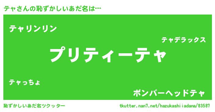 | 男性向けラノベタイトル風あだ名 | 『転生したらテャだった件』『テャの憂鬱』 |