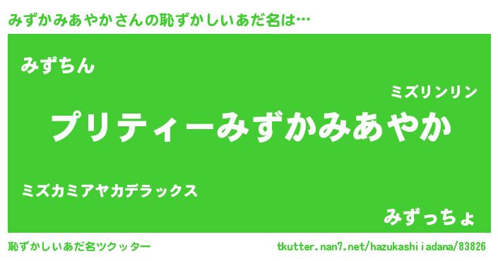 | ヘコむあだ名 | 『みずにゅー』『みずかみあやか(遠い目)』 |
