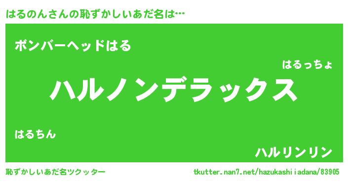 | 男性向けラノベタイトル風あだ名 | 『はるのん~年齢イコール彼女いない歴の魔法使い~』 |
