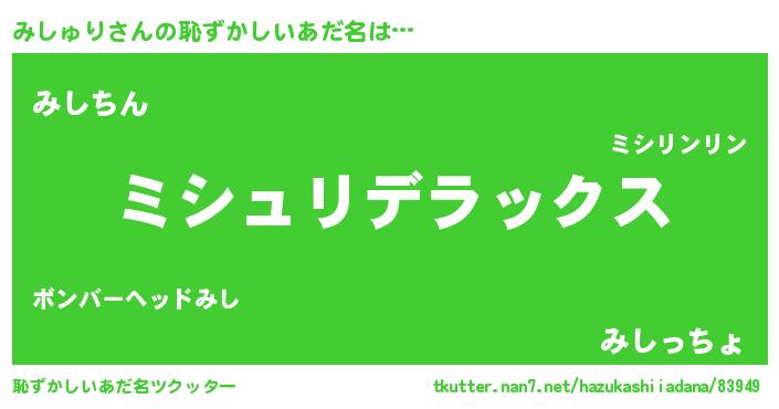 | 意味不明あだ名 | 『自称みしゅり』『永久保存みしゅり』 |