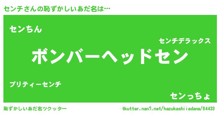 センチさんの恥ずかしいあだ名は… 『ボンバーヘッドセン』『センちん』『センっちょ』 ツクッター #恥ずかしいあだ名ツクッター http://tkutter.nan7.net/hazukashiiadana/84433/