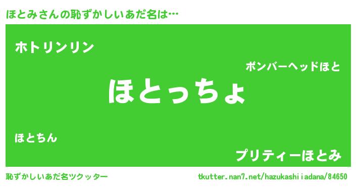 | 女子向けラノベタイトル風あだ名 | 『ほとみの雑貨屋さん』『ほとみ恋絵巻』 |