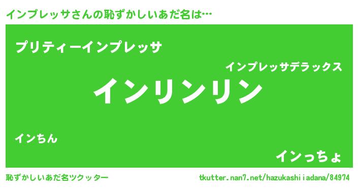 インプレッサさんの恥ずかしいあだ名は… 『インリンリン』『プリティーインプレッサ』『インっちょ』 ツクッター #恥ずかしいあだ名ツクッター http://tkutter.nan7.net/hazukashiiadana/84974/