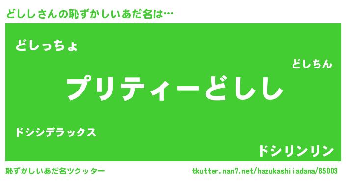 | 男性向けラノベタイトル風あだ名 | 『どしし~年齢イコール彼女いない歴の魔法使い~』 |