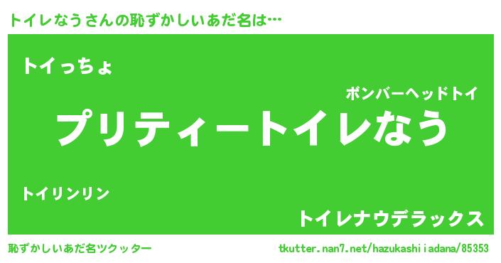 トイレなうさんの恥ずかしいあだ名は… 『プリティートイレなう』『トイっちょ』『トイレナウデラックス』 ツクッター #恥ずかしいあだ名ツクッター http://tkutter.nan7.net/hazukashiiadana/85353/