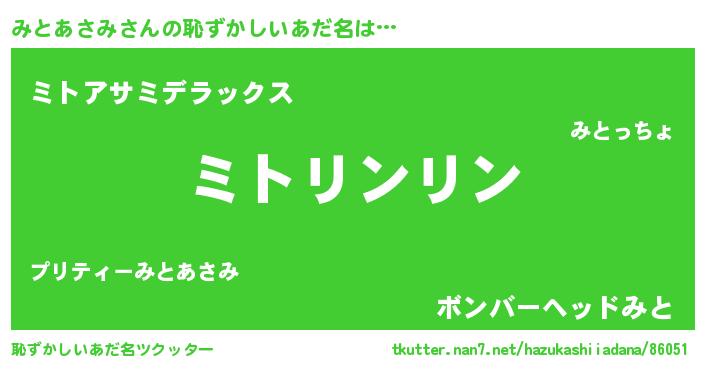 | 男性向けラノベタイトル風あだ名 | 『みとあさみの嫁は女の子じゃないと思った?』 |