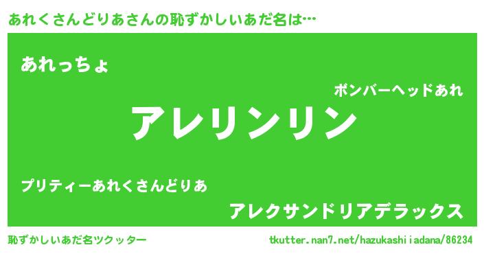 | 男性向けラノベタイトル風あだ名 | 『あれくさんどりあの嫁は女の子じゃないと思った?』 |