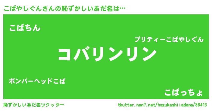 こばやしぐんさんの恥ずかしいあだ名は… 『コバリンリン』『こばちん』『こばっちょ』 ツクッター #恥ずかしいあだ名ツクッター http://tkutter.nan7.net/hazukashiiadana/86413/