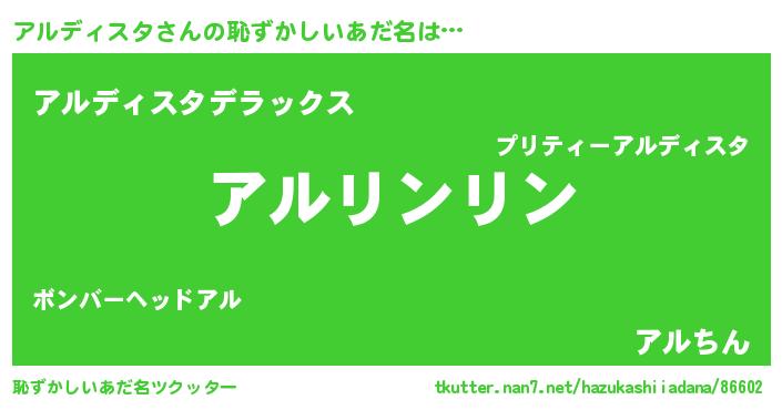| 男性向けラノベタイトル風あだ名 | 『アルディスタの嫁は女の子じゃないと思った?』 |