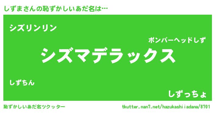 | ヒーロー風カッコイイあだ名 | 『仮面シズダー』『超時空戦士シズマ』 |