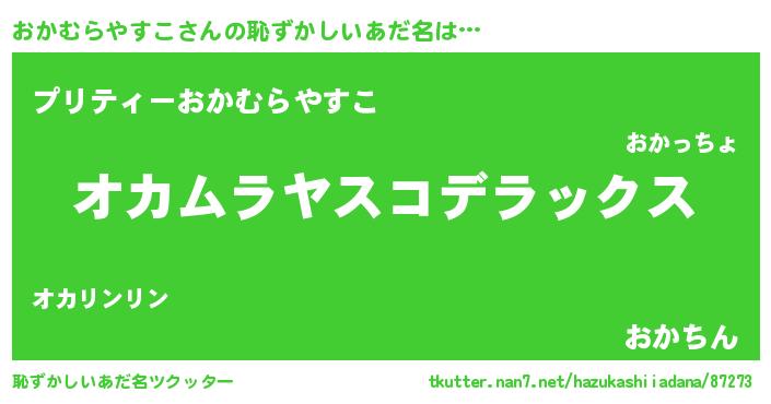 | 男性向けラノベタイトル風あだ名 | 『おかむらやすこ~年齢イコール彼女いない歴の魔法使い~』 |