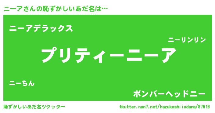 | 男性向けラノベタイトル風あだ名 | 『緋弾のニーア』 |