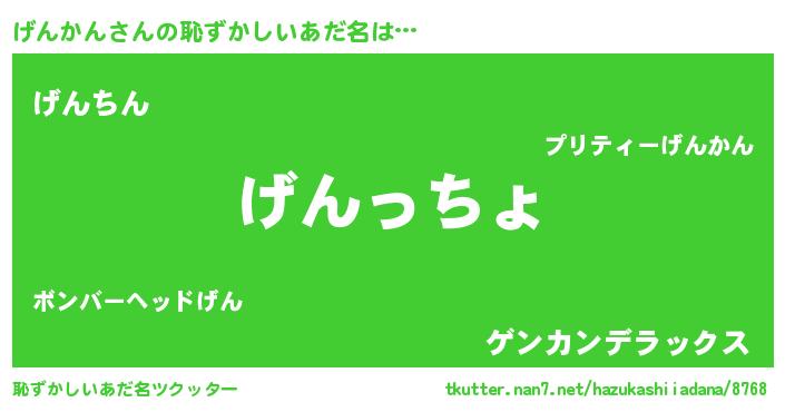 げんかんさんの恥ずかしいあだ名は… 『げんっちょ』『げんちん』『ゲンカンデラックス』 ツクッター #恥ずかしいあだ名ツクッター http://tkutter.nan7.net/hazukashiiadana/8768/