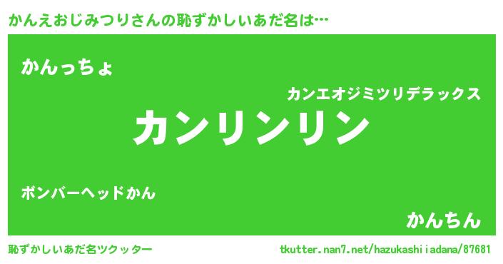 | 男性向けラノベタイトル風あだ名 | 『かんえおじみつりの嫁は女の子じゃないと思った?』 |