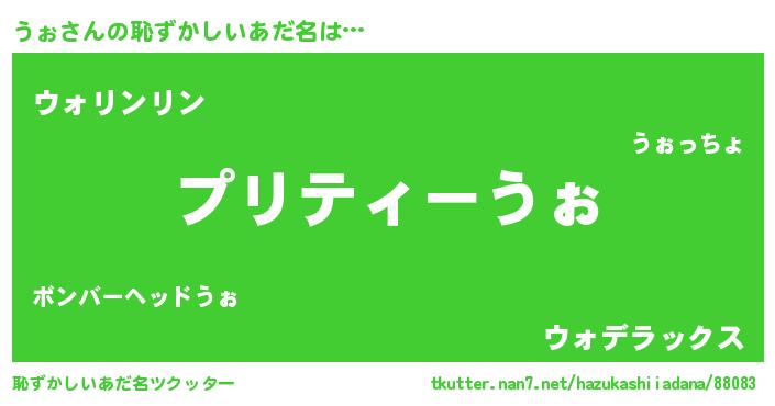 うぉさんの恥ずかしいあだ名は… 『プリティーうぉ』『ウォリンリン』『ウォデラックス』 ツクッター #恥ずかしいあだ名ツクッター http://tkutter.nan7.net/hazukashiiadana/88083/