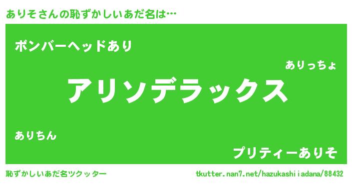 | 男性向けラノベタイトル風あだ名 | 『Re:ありそから始める異世界生活』 |