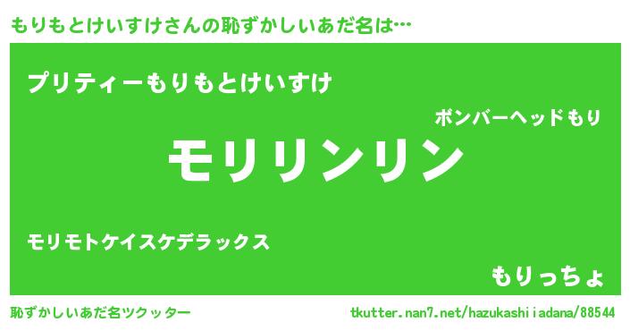 | 男性向けラノベタイトル風あだ名 | 『もりもとけいすけ~年齢イコール彼女いない歴の魔法使い~』 |