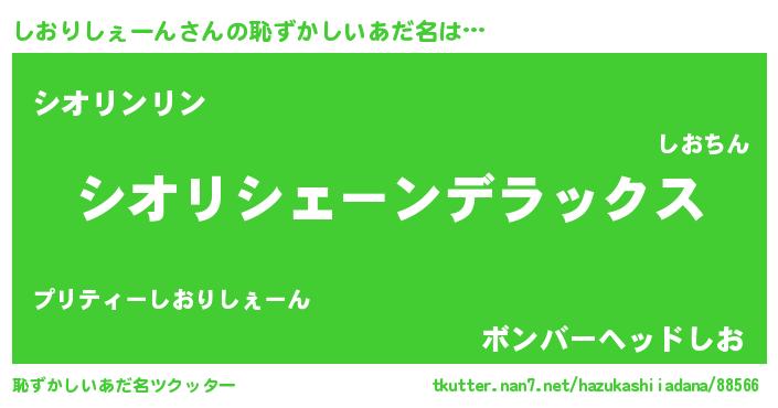 しおりしぇーんさんの恥ずかしいあだ名は… 『シオリシェーンデラックス』『シオリンリン』『ボンバーヘッドしお』 ツクッター #恥ずかしいあだ名ツクッター http://tkutter.nan7.net/hazukashiiadana/88566/