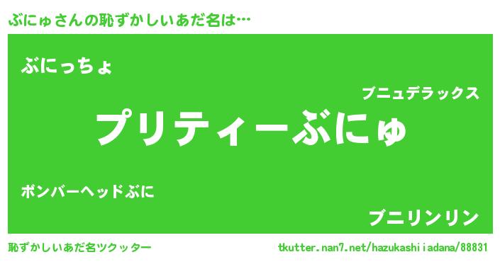 | 男性向けラノベタイトル風あだ名 | 『魔弾の王とぶにゅ』『ぶにゅの憂鬱』 |