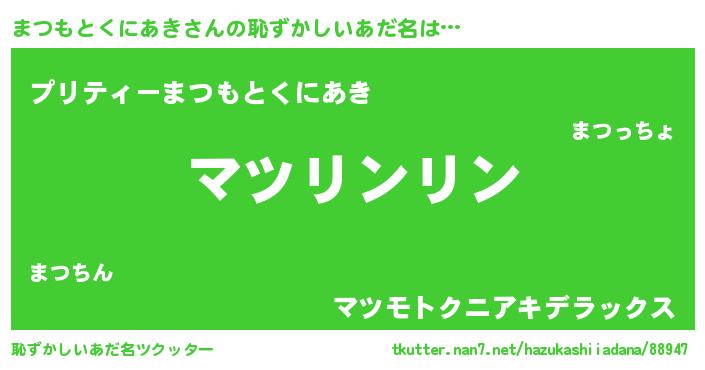 | 男性向けラノベタイトル風あだ名 | 『まつもとくにあきの嫁は女の子じゃないと思った?』 |