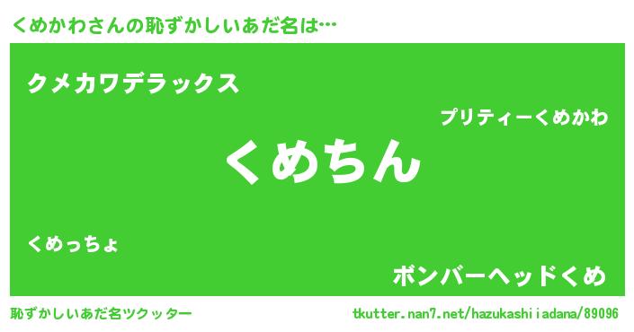 | ヘコむあだ名 | 『くめかわ(笑)』『くめにー』『豆乳』 |