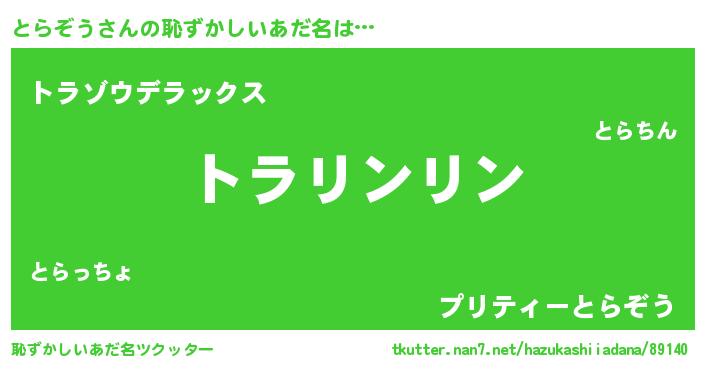 | 男性向けラノベタイトル風あだ名 | 『とらぞうの嫁は女の子じゃないと思った?』 |