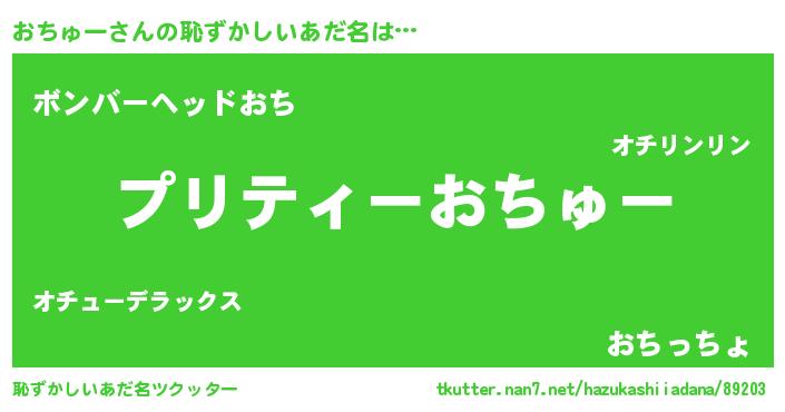 | 男性向けラノベタイトル風あだ名 | 『この素晴らしい世界におちゅーを!』 |