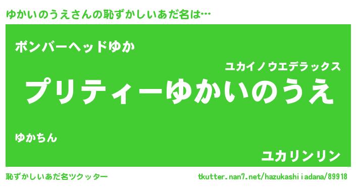 ゆかいのうえさんの恥ずかしいあだ名は… 『プリティーゆかいのうえ』『ボンバーヘッドゆか』『ユカリンリン』 ツクッター #恥ずかしいあだ名ツクッター http://tkutter.nan7.net/hazukashiiadana/89918/