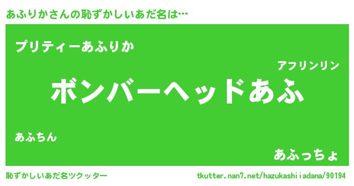 | ヒーロー風カッコイイあだ名 | 『正義の使者あふりか』『魔戒騎士アフ』 |
