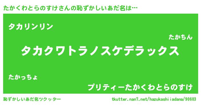 | 男性向けラノベタイトル風あだ名 | 『Re:たかくわとらのすけから始める異世界生活』 |