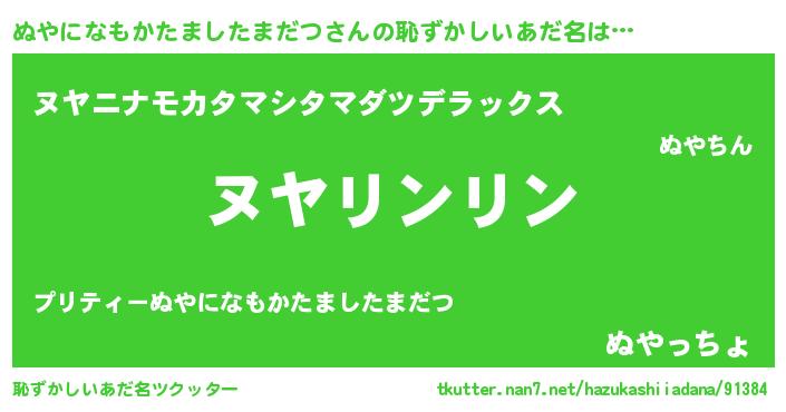 | 男性向けラノベタイトル風あだ名 | 『ヌヤニナモカタマシタマダツスレイヤー』 |
