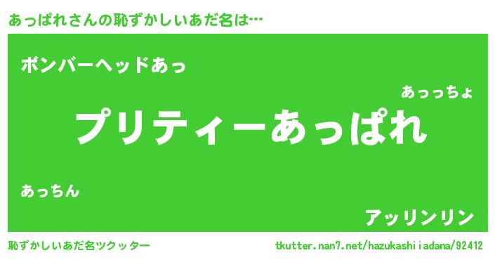 | 意味不明あだ名 | 『住所不定無職あっぱれ(6歳)』 |