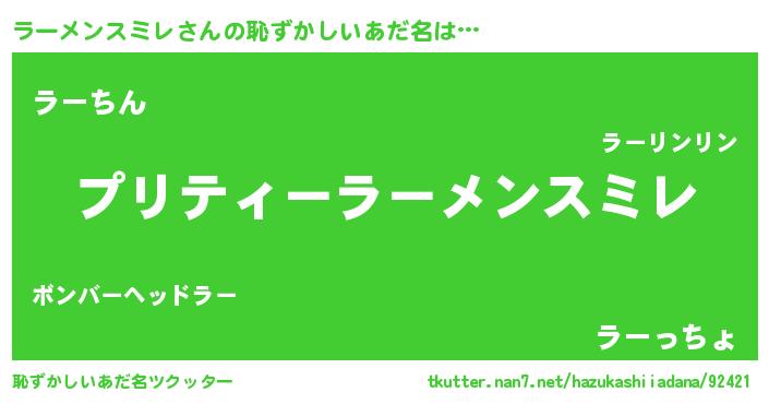 | 伝説のあだ名 | 『伝説のスナイパーラーメンスミレ』 |