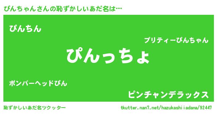 | 男性向けラノベタイトル風あだ名 | 『この素晴らしい世界にぴんちゃんを!』 |