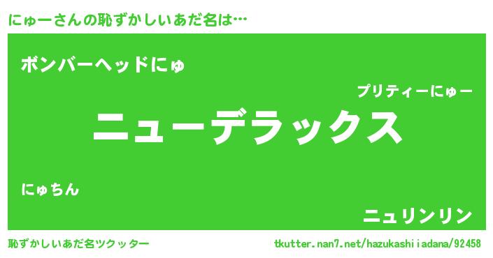 にゅーさんの恥ずかしいあだ名は… 『ニューデラックス』『ボンバーヘッドにゅ』『ニュリンリン』 ツクッター #恥ずかしいあだ名ツクッター http://tkutter.nan7.net/hazukashiiadana/92458/