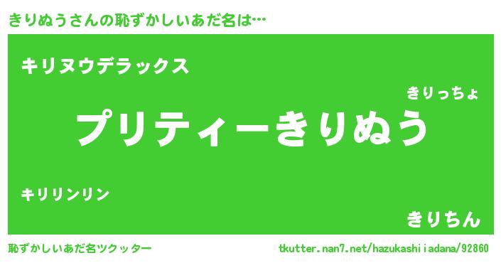 | 男性向けラノベタイトル風あだ名 | 『キリヌウスレイヤー』『きりぬうの憂鬱』 |