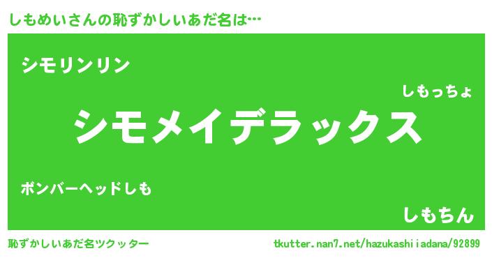 | 意味不明あだ名 | 『自称しもめい』『永久保存しもめい』 |