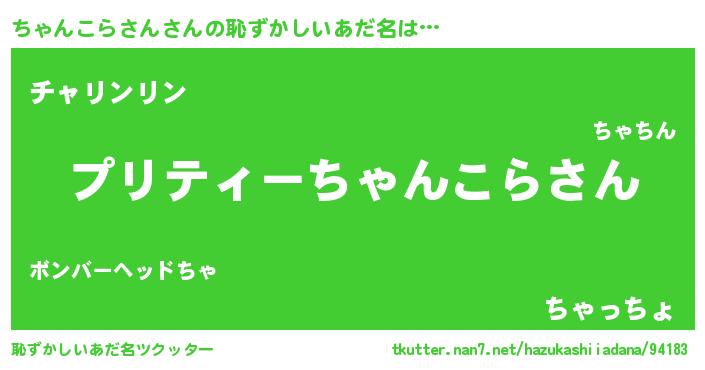 | 男性向けラノベタイトル風あだ名 | 『ちゃんこらさん~年齢イコール彼女いない歴の魔法使い~』 |