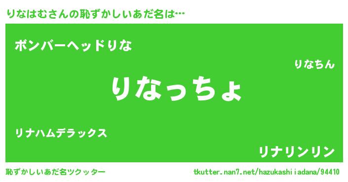 | 男性向けラノベタイトル風あだ名 | 『この素晴らしい世界にりなはむを!』 |