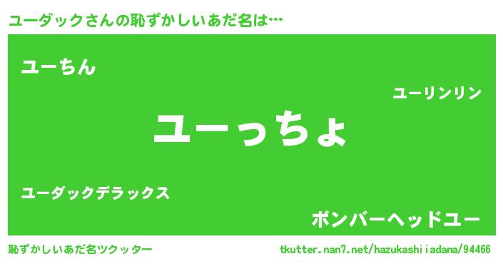 ユーダックさんの恥ずかしいあだ名は… 『ユーっちょ』『ユーちん』『ボンバーヘッドユー』 ツクッター #恥ずかしいあだ名ツクッター http://tkutter.nan7.net/hazukashiiadana/94466/