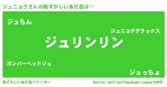 | 男性向けラノベタイトル風あだ名 | 『ジュニョクの嫁は女の子じゃないと思った?』 |