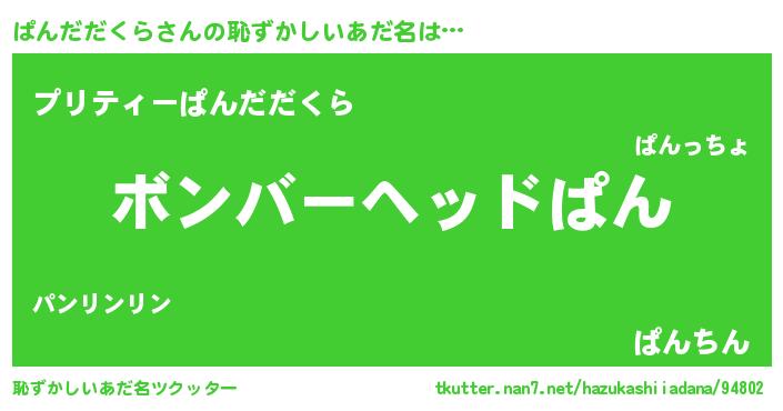 ぱんだだくらさんの恥ずかしいあだ名は… 『ボンバーヘッドぱん』『プリティーぱんだだくら』『ぱんちん』 ツクッター #恥ずかしいあだ名ツクッター http://tkutter.nan7.net/hazukashiiadana/94802/