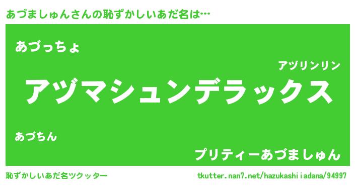 あづましゅんさんの恥ずかしいあだ名は… 『アヅマシュンデラックス』『あづっちょ』『プリティーあづましゅん』 ツクッター #恥ずかしいあだ名ツクッター http://tkutter.nan7.net/hazukashiiadana/94997/