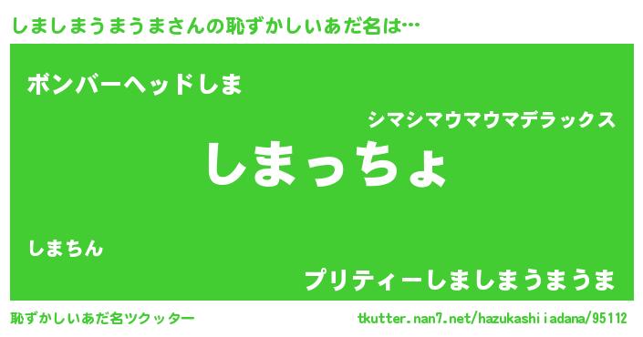 | 男性向けラノベタイトル風あだ名 | 『しましまうまうま~年齢イコール彼女いない歴の魔法使い~』 |
